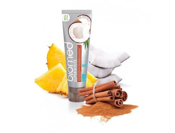 Zubna pasta za nježno izbjeljivanje zubi Superwhite je 99% prirodna pasta za zube koja umiruje desni i remineralizira zubnu caklinu. Uklanja plak i nježno polira caklinu, a pomaže i umiriti zubno meso.